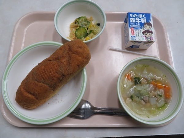 本日の給食で、新メニューとなる「キャラメル揚げパン」が提供されました!実際食べてみると、かなり大きめの揚げパンではありましたが、キャラメルの風味がしっかりありながらも甘すぎないので、あっという間に食べ終えることができました。とても美味しかったと思います。また、「ガルビュールスープ」というフランスの南西部ベルヌア地方の家庭料理も提供されました。こちらは、白いんげん豆とたっぷりの野菜、ベーコンを煮込んだ料理です。今回は特に、存在感のあった「カブ」がとても印象に残りました。