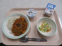 本日の給食で提供された「夏野菜ドライカレー」ですが、トマト・なす・ピーマン・かぼちゃといった夏野菜がたっぷり入っていました!まだまだ日中の日差しが強い中、体調を整えるためにもしっかりと食事をとることは必要です!とりわけ野菜は免疫力向上、健康促進、夏バテ防止が期待できるものとされています。そういう意味にでは、給食は栄養にとても配慮して作られていると言えます。生徒の皆さんには、野菜の摂取を意識してほしいと思っています。