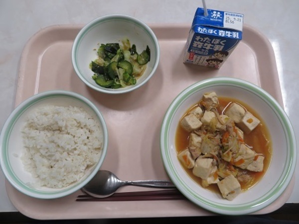 また、今日の給食は、「郷土料理:奈良県」と題して、「かしわのすきやき(鶏肉のすきやき)」と「もみうり(きゅうりの酢の物)」が提供されました。「かしわのすきやき」は昨年度も出され、生徒には大変好評だったとのことで、今年も再登場となったそうです。美味しくいただけたでしょうか?