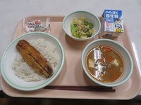 今日10月6日(月)は旧暦の8月15日にあたり、夜には十五夜「中秋の名月」が昇ります。少々雲行きが怪しく、お月さまを見得るのか心配です。給食では、「お月見献立」と題して、月に見立てた「さつま汁」、「お月見団子」、そして秋が旬のさんまを使った「さんまのかば焼き丼」が提供されました。「お月見団子」の中にみたらし団子でよく使われるタレが入っていたことに驚きでしたが、おいしくいただきました。