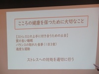 終業式に引き続き、「保健委員会」による活動内容の発表が行われました。パワポ資料をもとに、委員長と副委員長から分かりやすく説明されました。「こころの健康」を保つことは常に意識していきたいものです。