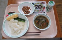 給食では、節分献立と題して、「セルフ恵方巻」「きなこ前」が提供されました。「セルフ恵方巻」は、酢飯と厚焼き玉子・きゅうり・納豆をのりで包んで完成となります。うまく巻けたでしょうか?