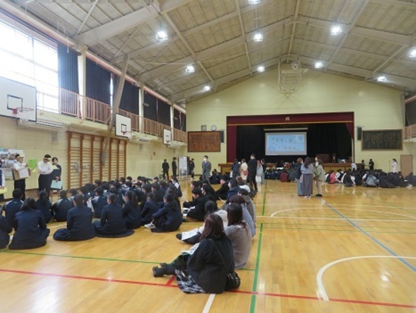 3年生が1年間、総合的な学習の時間で「SDGs」に関する取組を行ってきました。その成果を、「2026上中万博」と題して発表しました。全28グループがそれぞれのテーマに沿って活動してきた内容は、とても素晴らしいものだったと思います。単にインターネット等による調べ学習にとどまらず、校外に出てインタビューを行うなど、大変内容の濃い取組でした。保護者の皆様に加え、1年生も発表会に参加し、3年生の発表に熱心に耳を傾けていました。