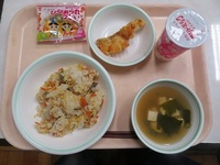 本日の給食は、「ひなまつり献立」と題して、「ひな寿司、ホキのゴールデンかぼすソース、すまし汁、ひなあられ、飲むヨーグルト」が提供されました。